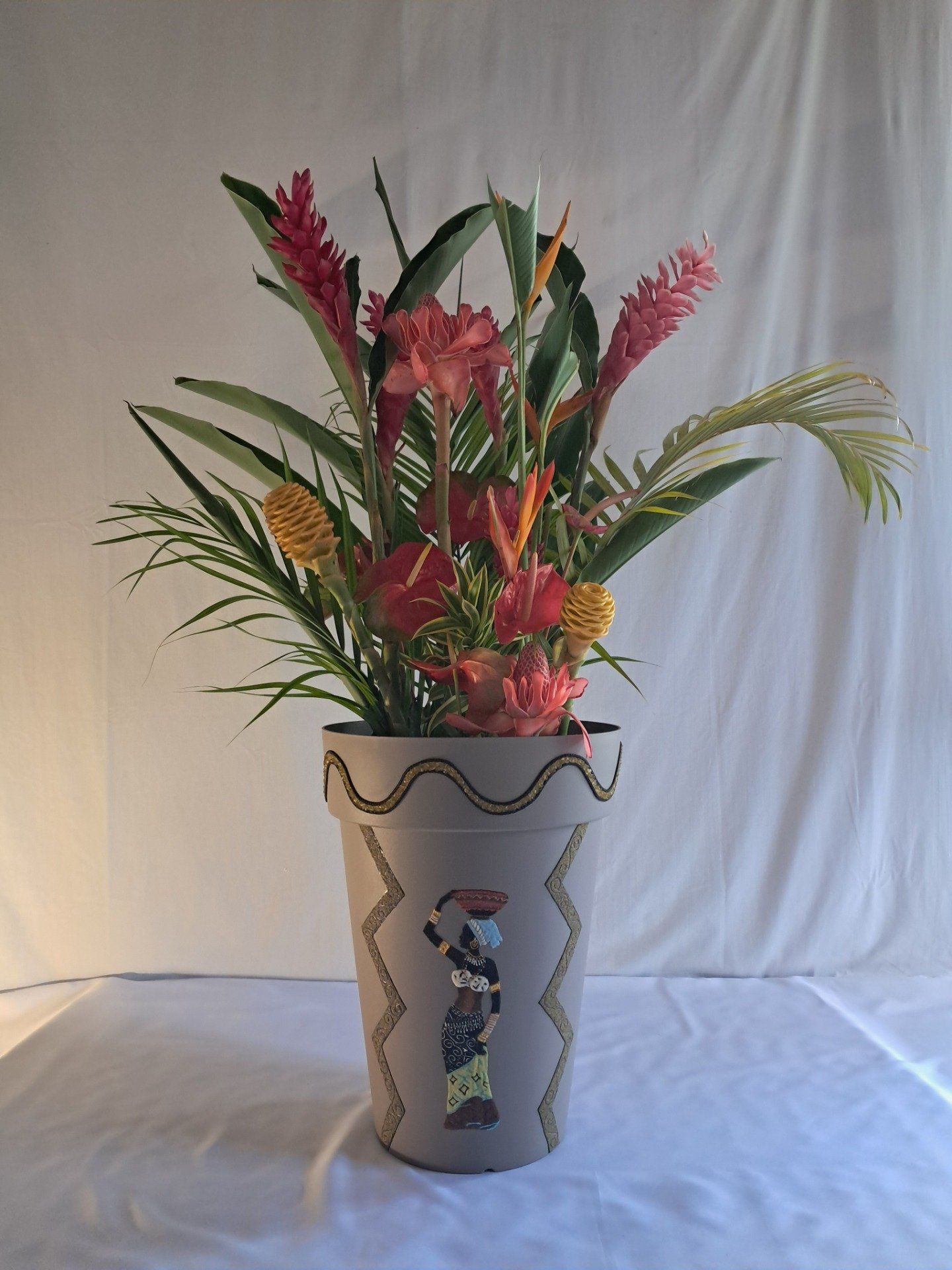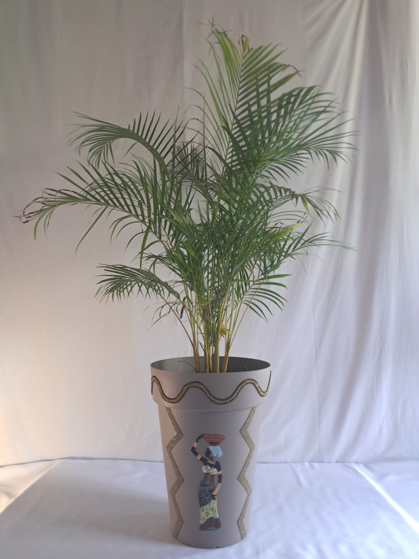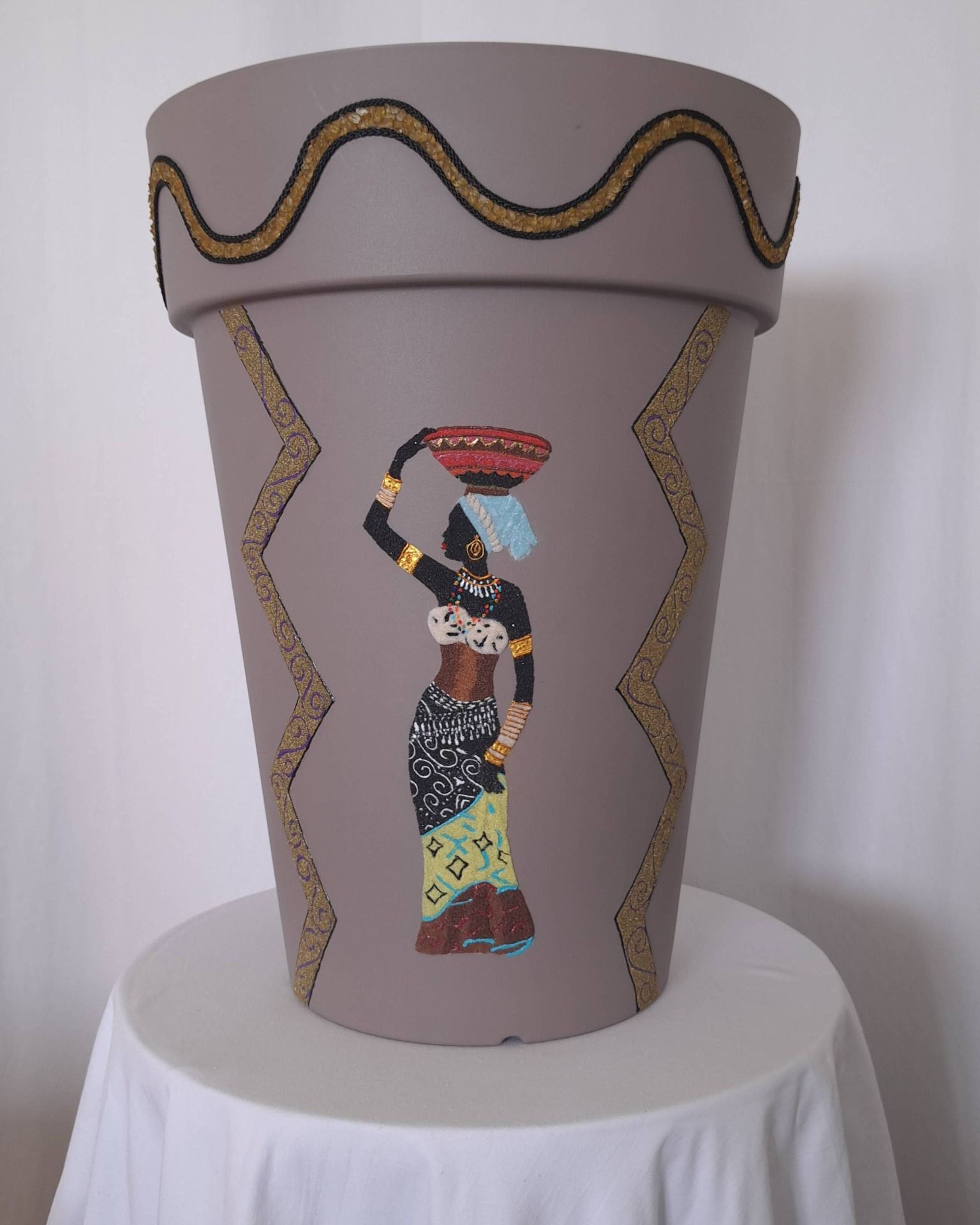Cache pot travaillé avec du sable et des pierres de couleurs, orné de cordelettes représentant une magnifique africaine. Design sublime. Extraordinaire dans: bureau, hôtel, restaurant ou dans une maison.