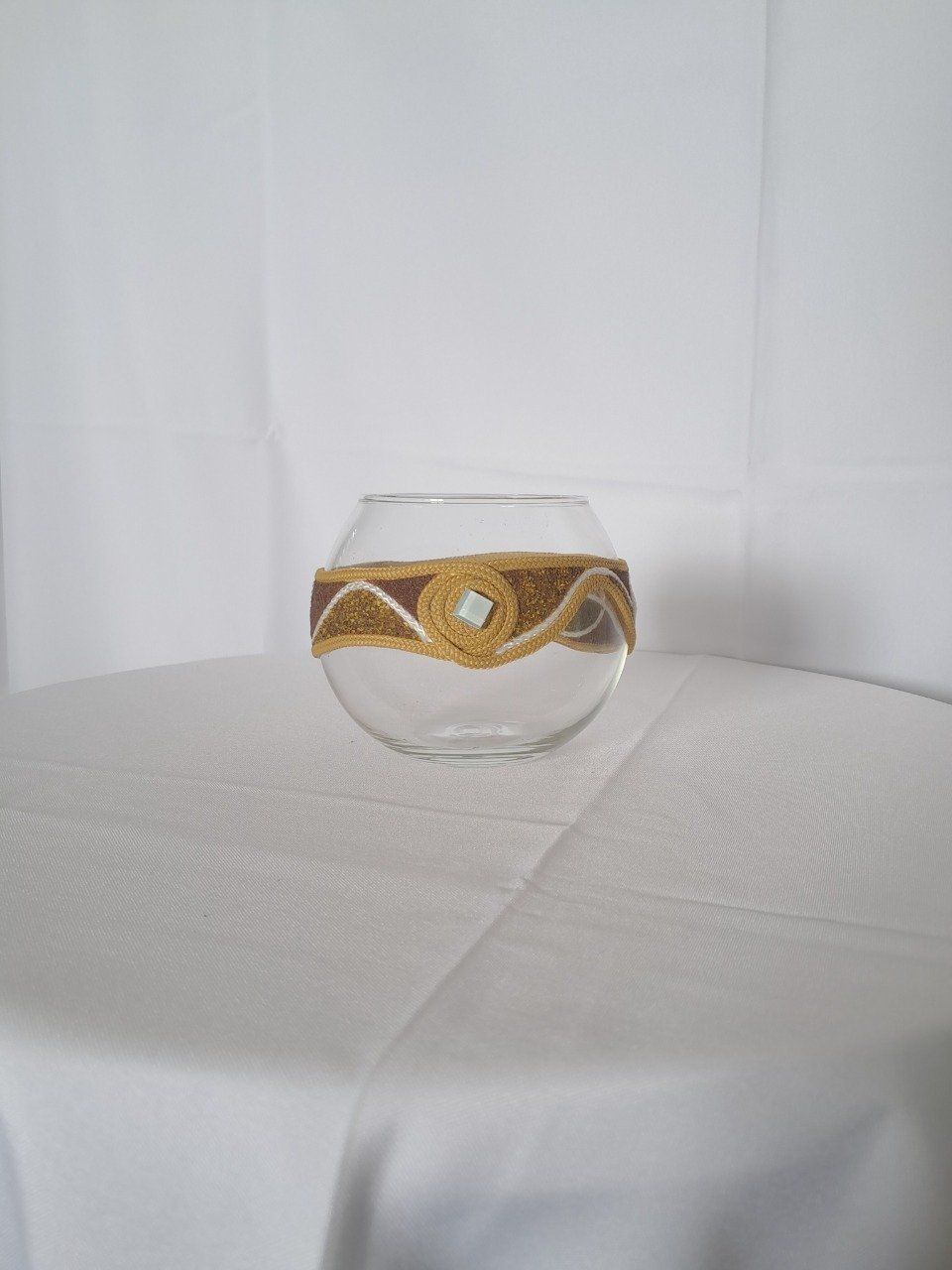 boule en verre travaillé avec du sable et de la cordelette de couleurs et pour finition un petit carreau blanc.