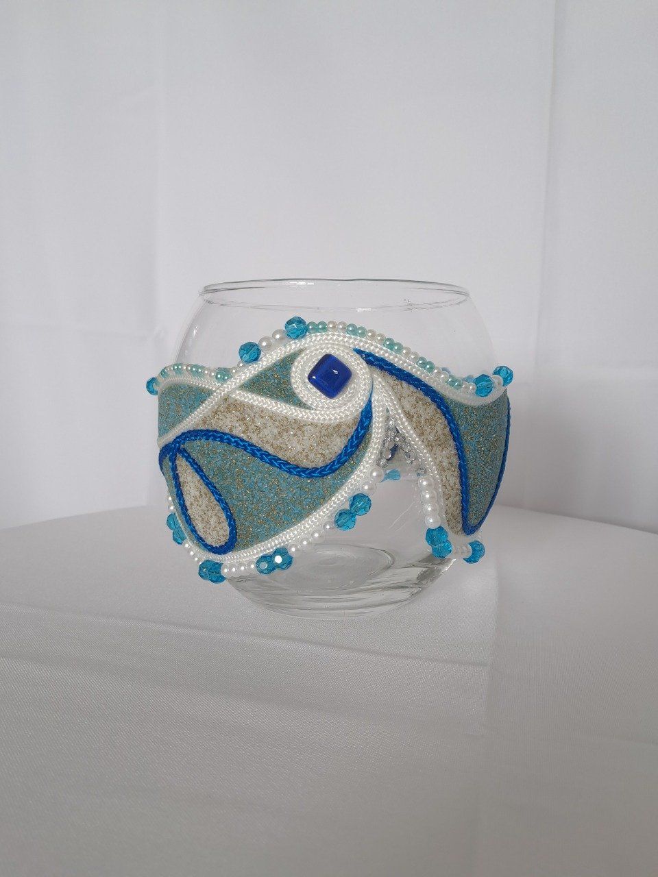 Boule en verre décoré avec du sable et de la cordelette: blanc et bleu. il est entouré par une magnifique chenette de perles.