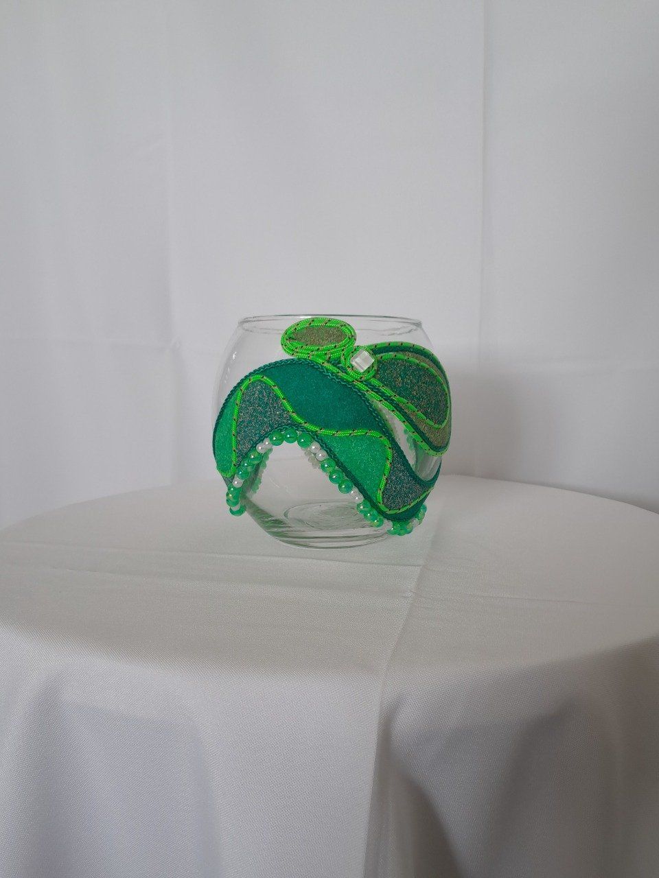 boule en verre travaillé avec du sables et de la cordelettes couleurs, avec des perles à la base.