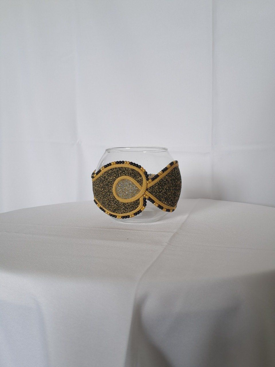 Boule en verre travaillé avec du sable et de la cordelette de couleurs le tout entouré de perle noir et doré ;
