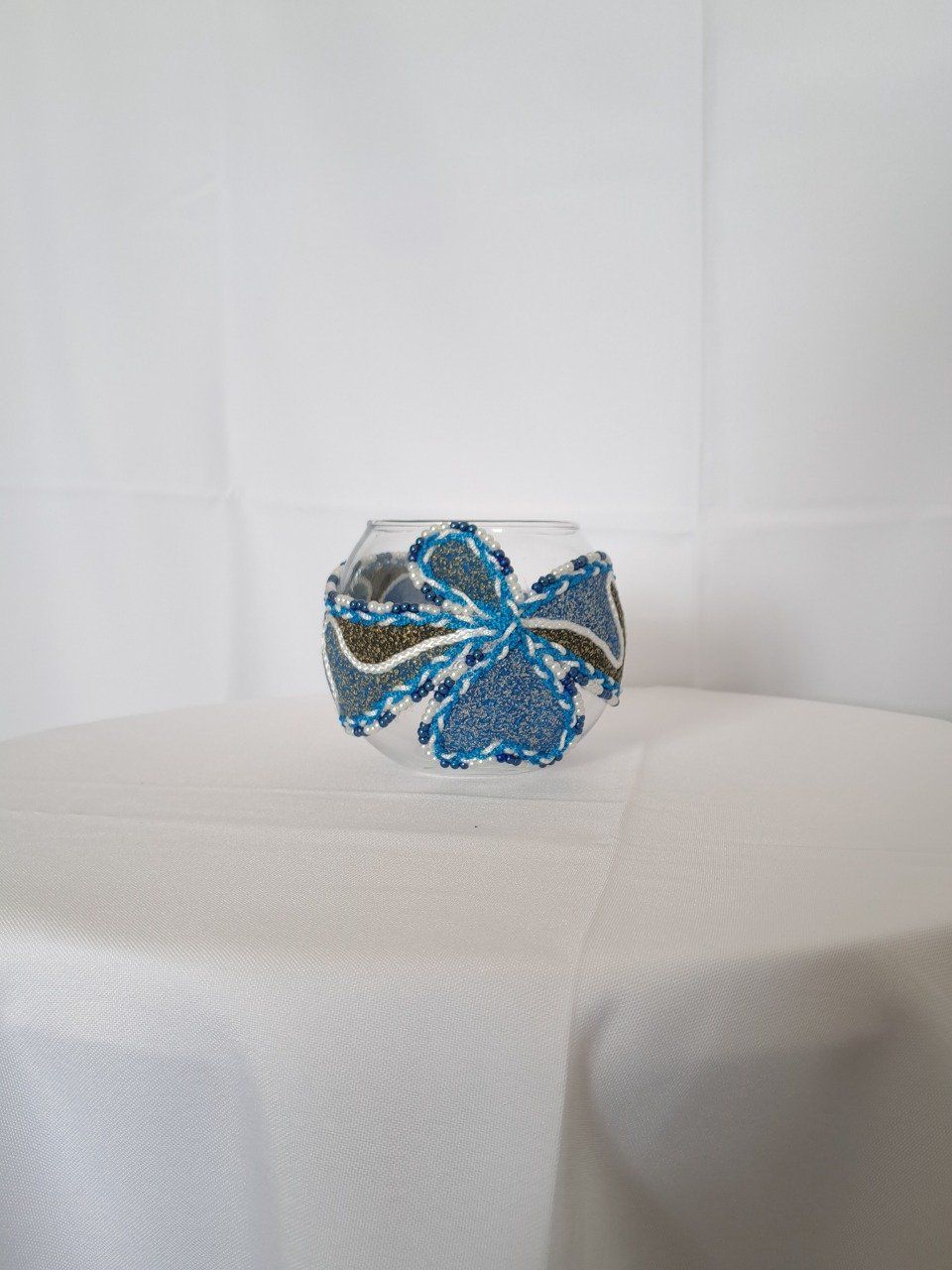 boule en verre travaillé avec du sable et de la cordelette tressé entouré d'une chenette de perles de couleurs bleu et blanc.