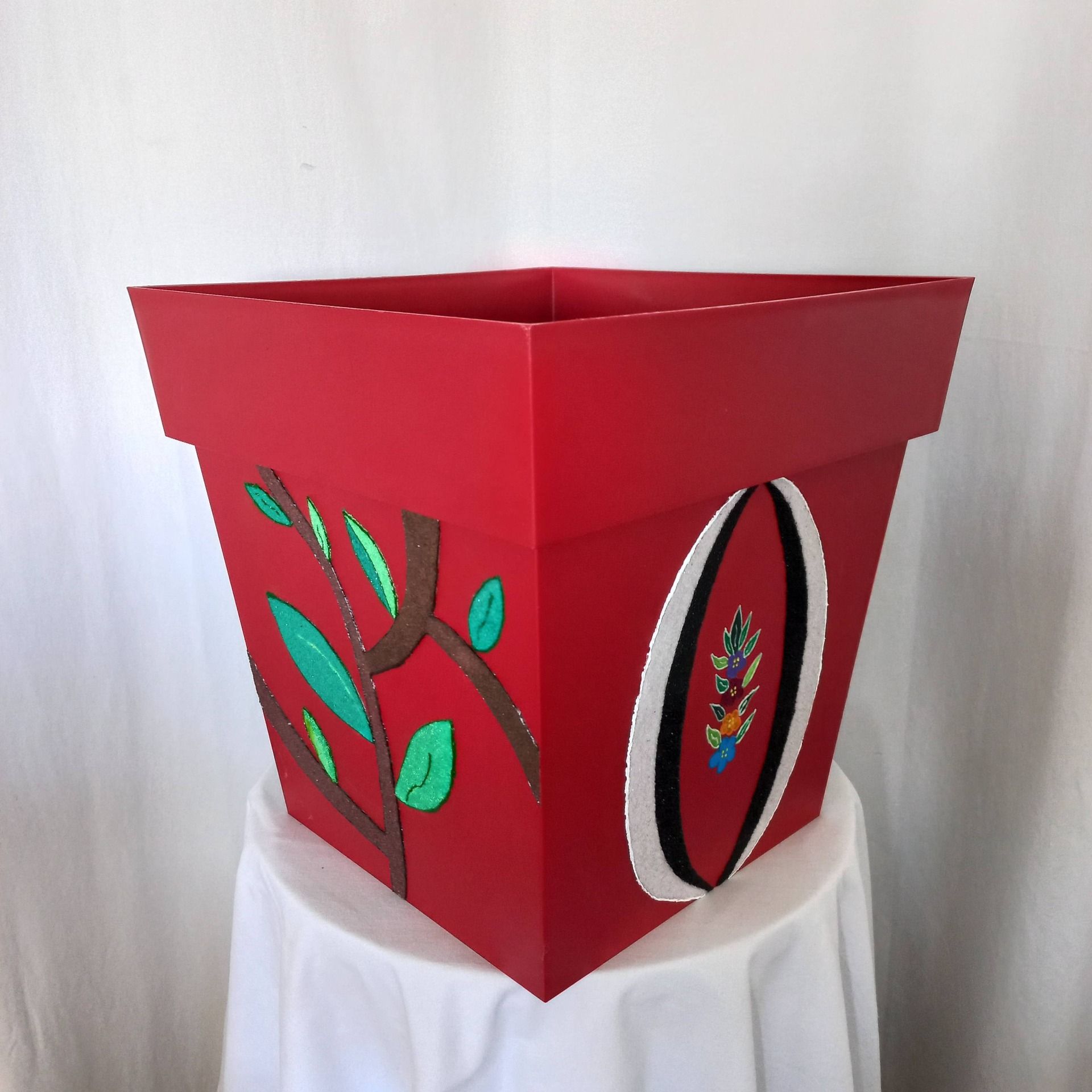 Cache pot carré travaillé avec du sable de couleur et de la peinture acrylique.