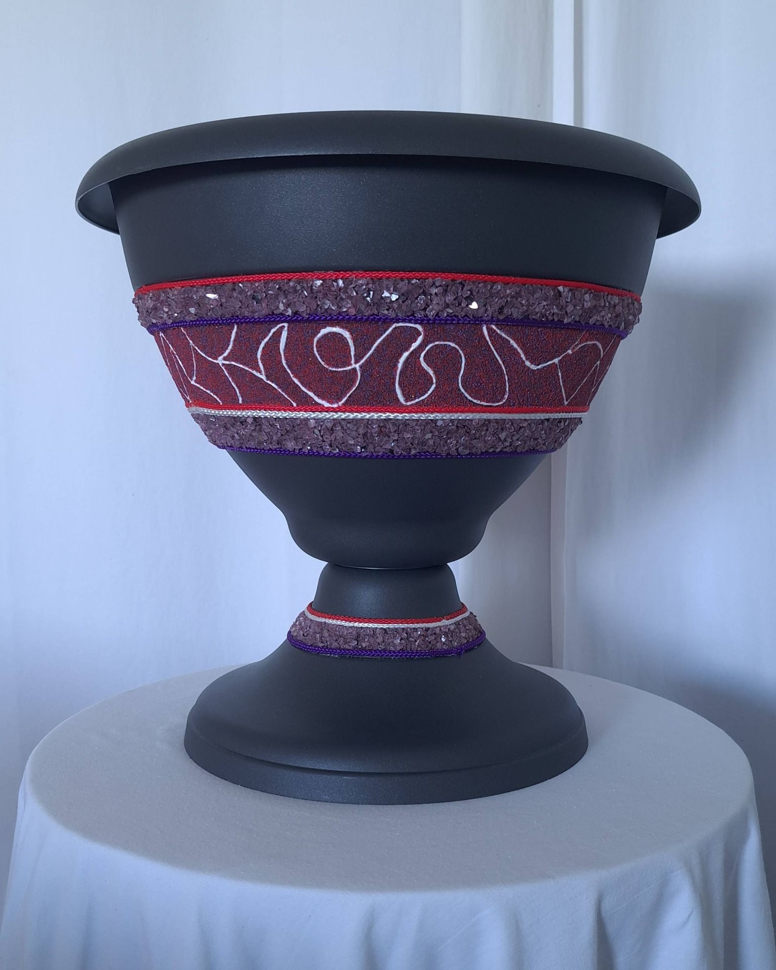 cache pot pied court noir travaillé avec des petites pierre à effet miroir, de cordelettes rouge, noir, blanc, centre sable de couleurs séparer par de la peinture 3D.Finition petits carreaux rouge et violet.