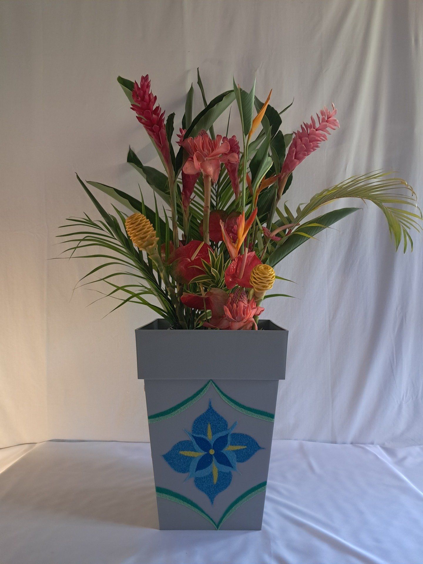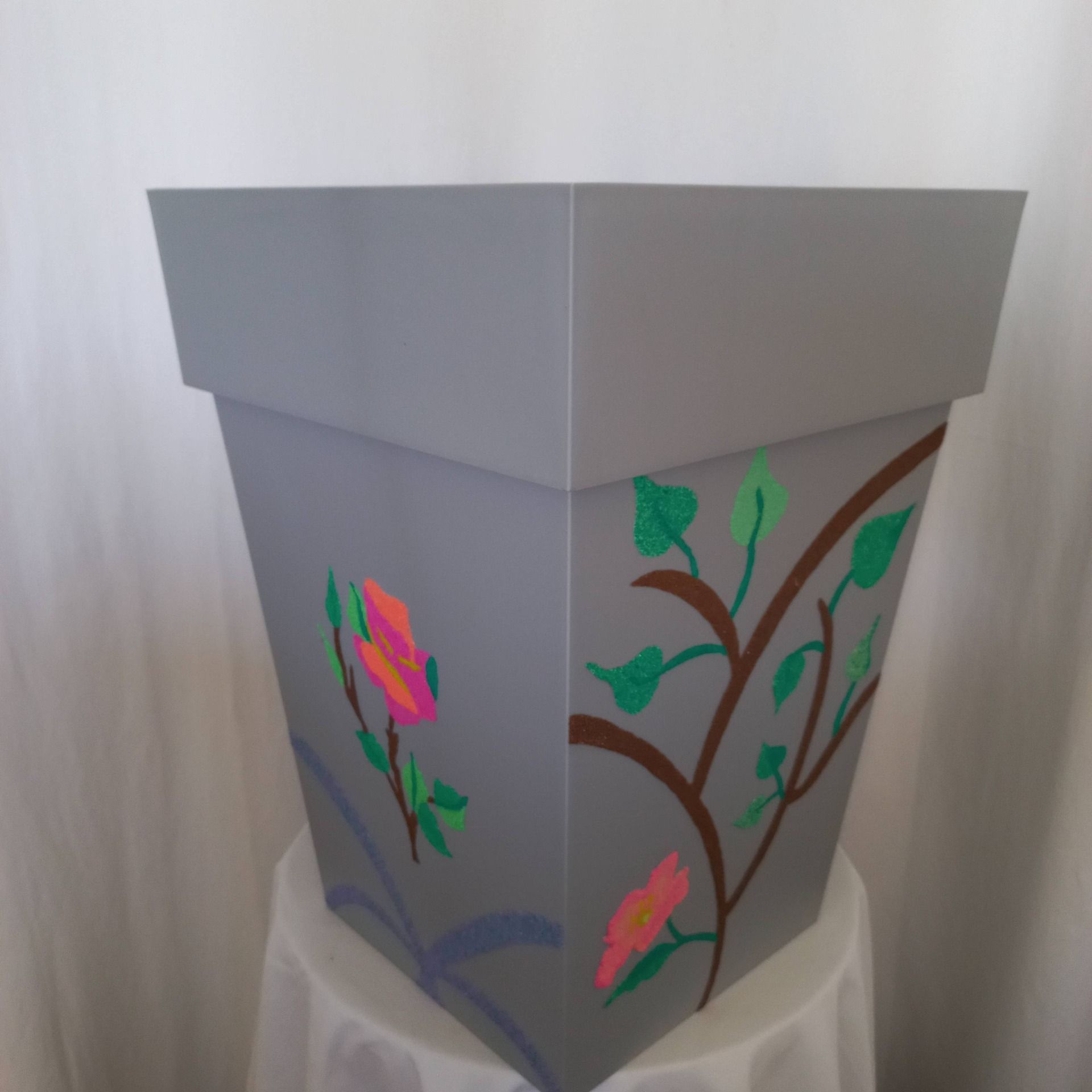 Cache pot travaillé avec du sable de couleurs, représentant des fleurs et des feuilles pouvant accueillir des grosses plants au choix.