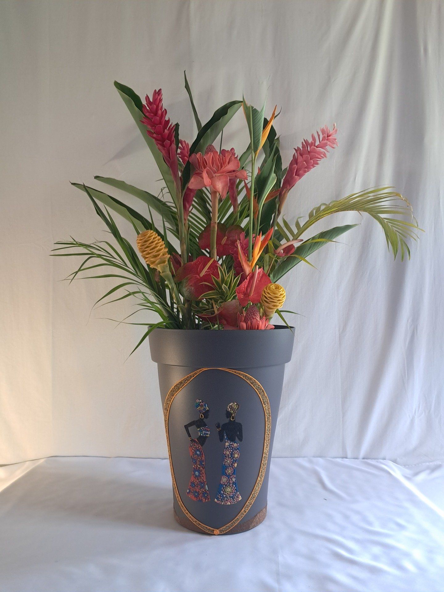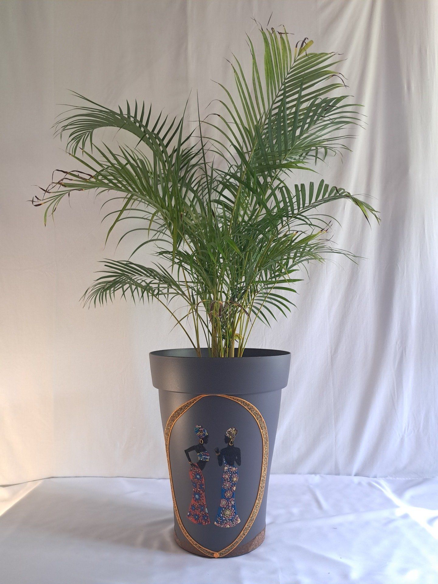 cache pot couleur noir décorer avec deux magnifiques africaines lui donnant un charme extraordinaire .Travaillé avec du sable de couleurs et de la peinture trois D pour les bijoux.