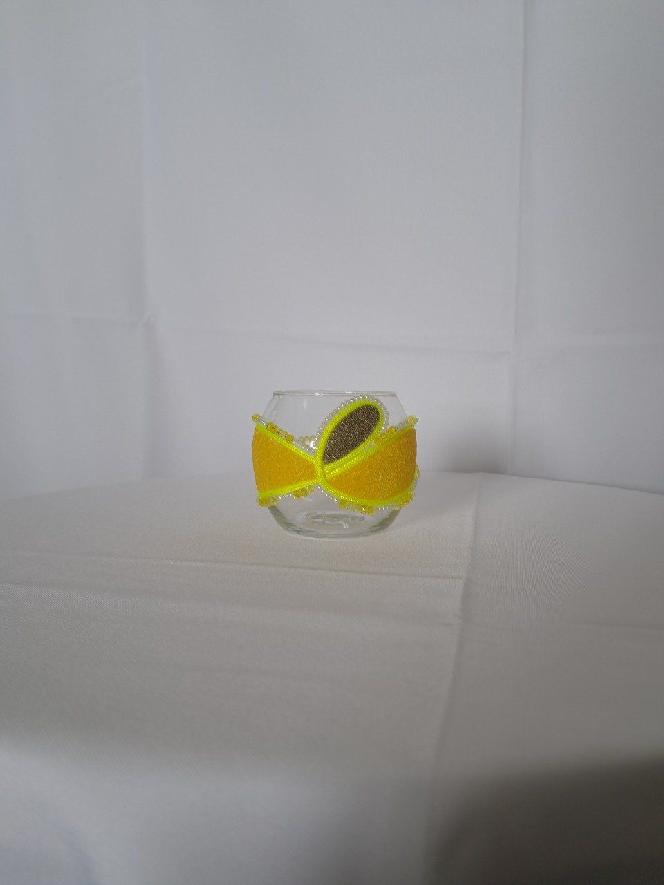 Petite boule en verre travaillée avec du sable de couleurs jaune entouré de perles jaunes et blanc/nacré.