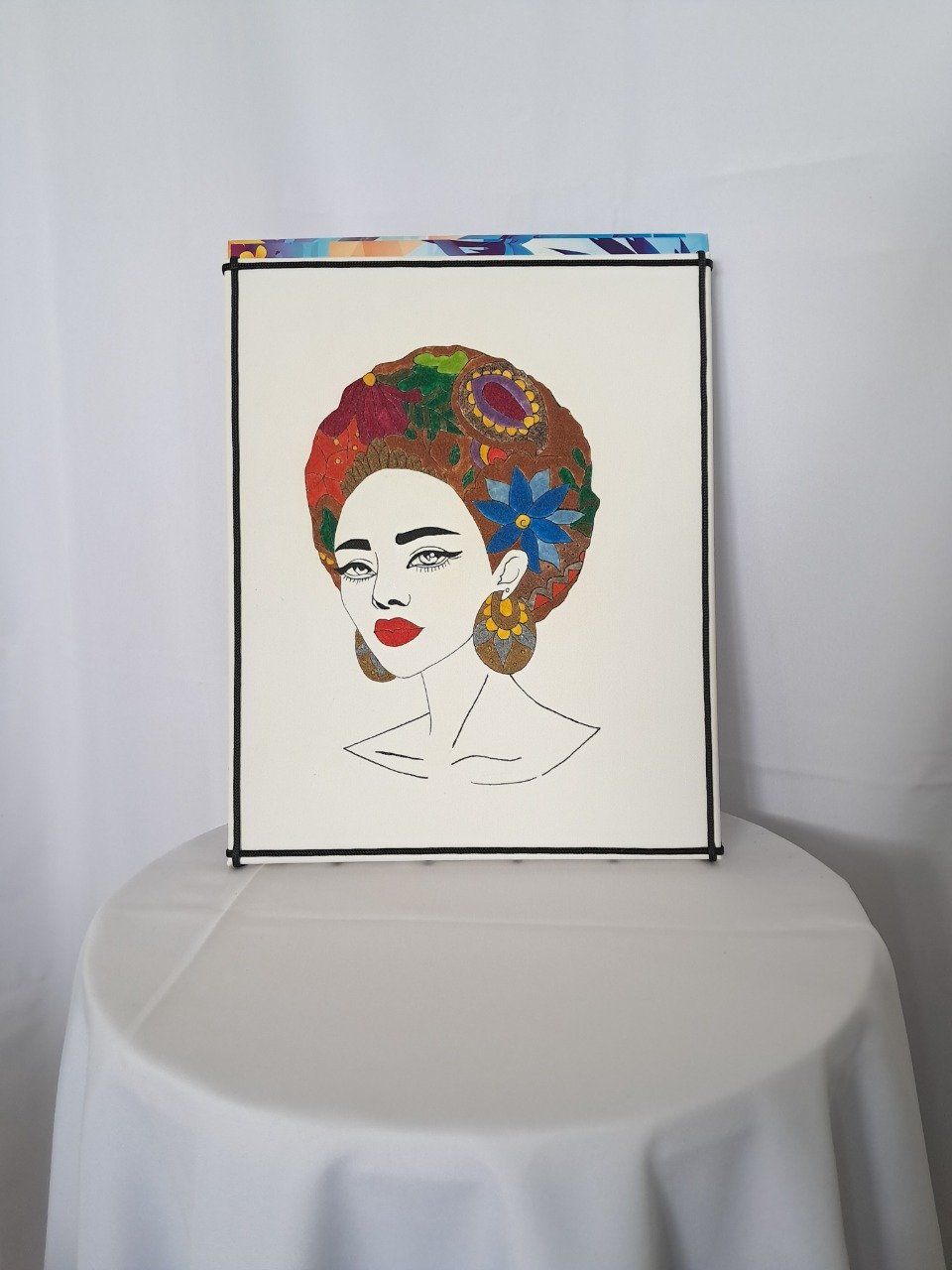 Tableau représentant une femme travaillé avec du sable de couleurs et de la peinture acrylique.
