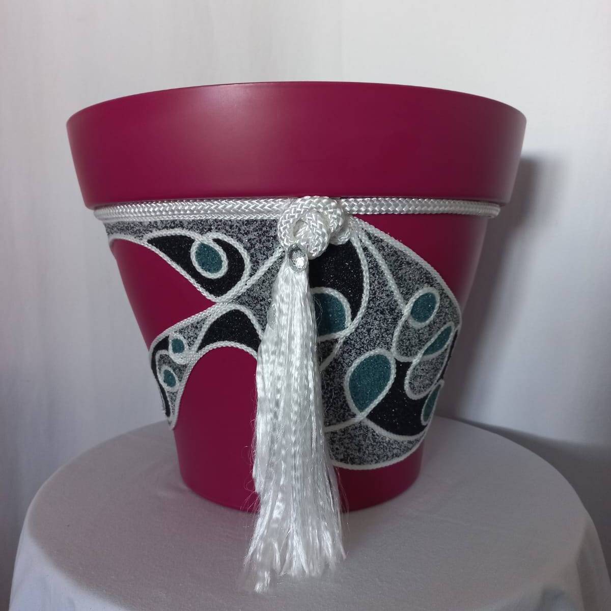 Cache pot de couleur fuchsia travailler avec du sable et de la grosse et petite cordelette.