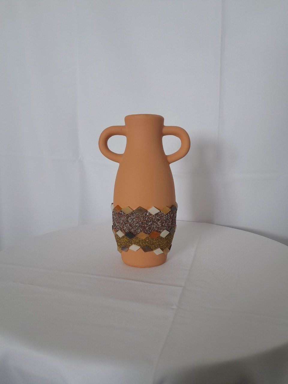 vase en poterie travaillé avec des petits carreaux de couleurs en losange et du sable de couleurs.