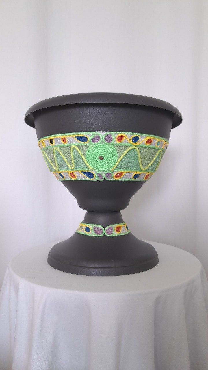 Cache pot sur pied court de couleur noir travaillé avec du sable et de la cordelette couleurs.