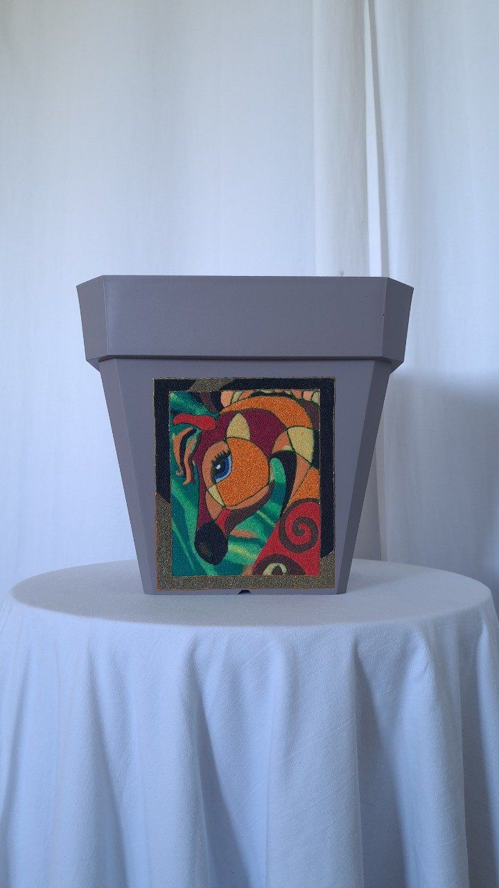 Cache pot de forme carré travaillé avec du sable de couleurs et de la peinture acrylique. Trois face décoré une représentant une biche et les autres de l'abstrait.