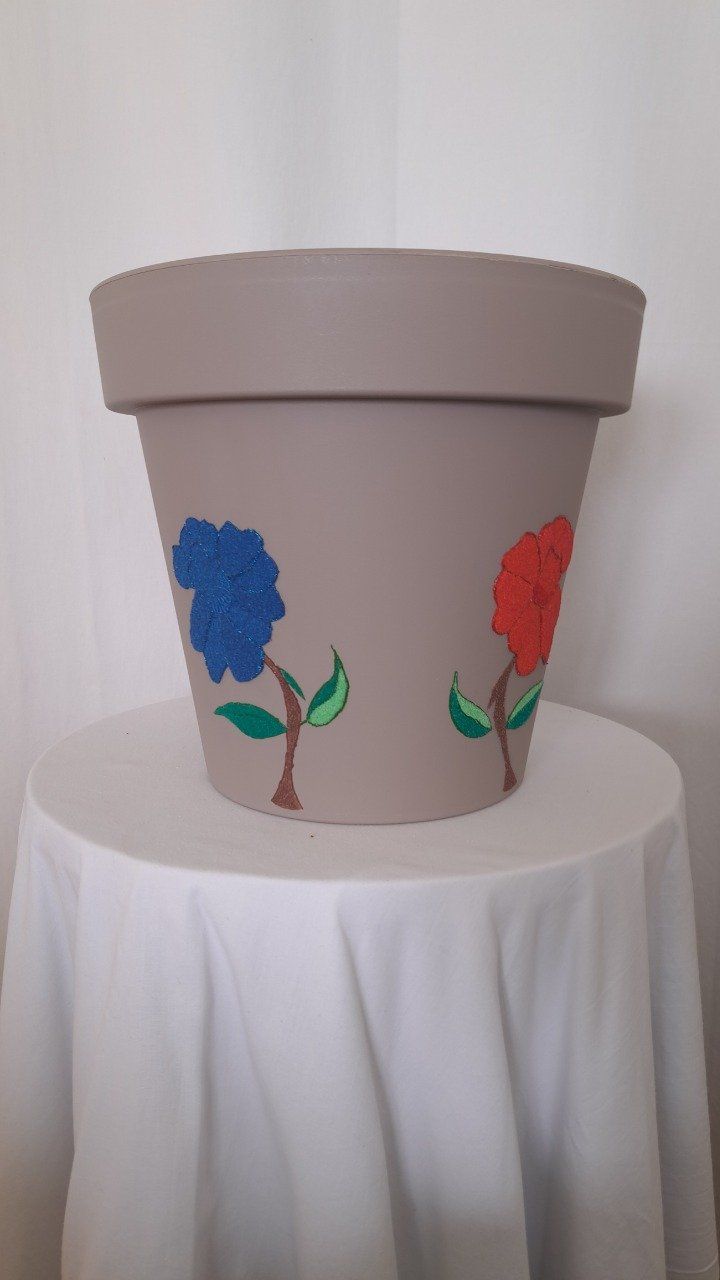 Cache pot travaillé avec du sable de couleurs et de la peinture acrylique représentant trois magnifique fleurs.