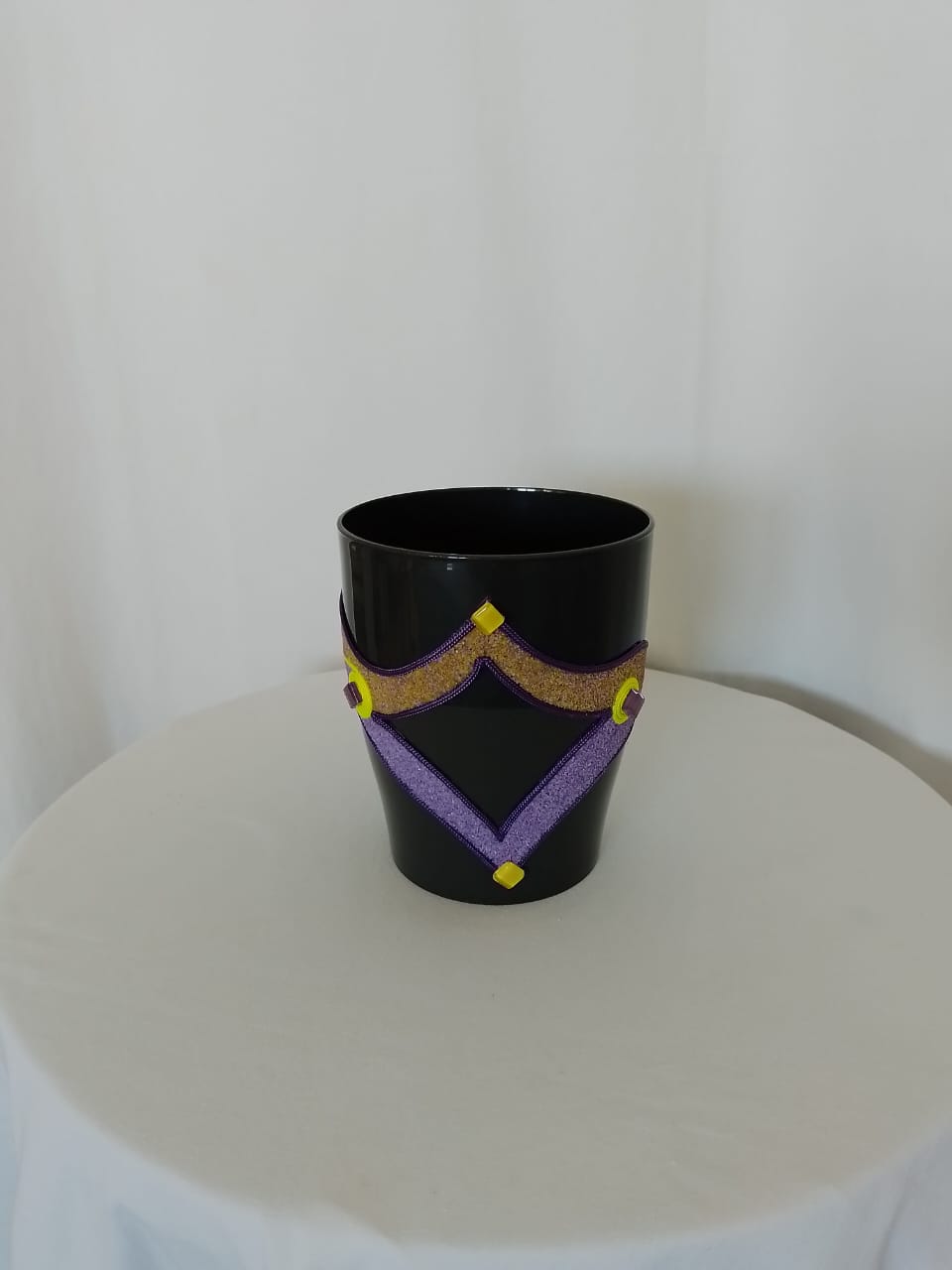cache pot brillant noir travaillé avec du sable et de la cordelette de couleurs.