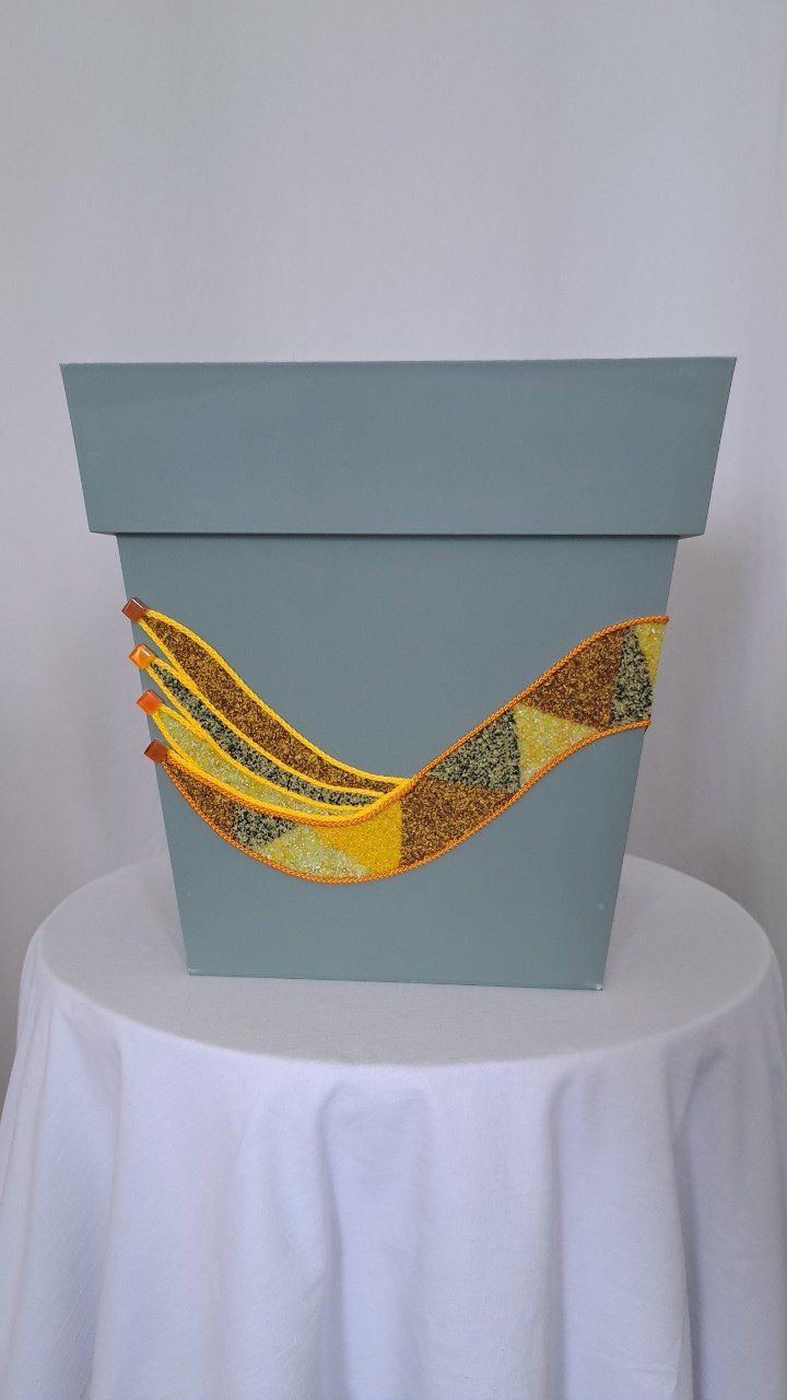 cache pot de forme carré, trois faces son travaillé avec du sable de couleurs elles ont chacune un styles différents et pour finition elles ont des petits carreaux.