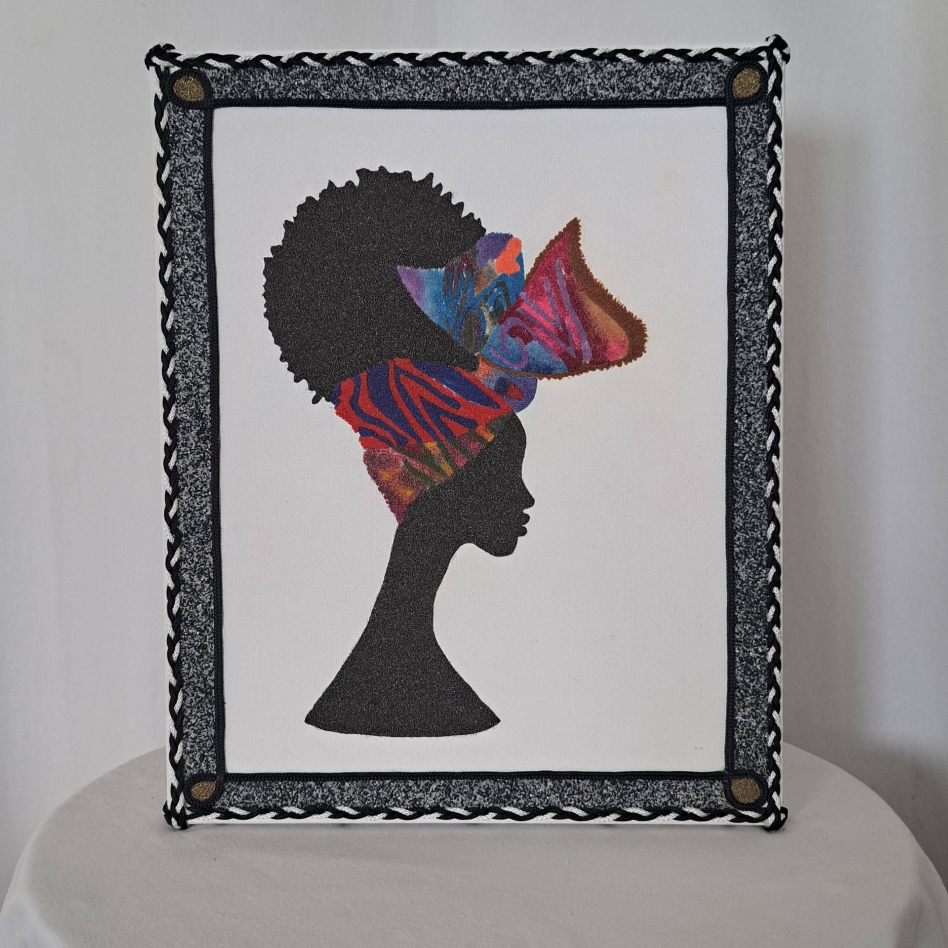 Tableau travaillé avec du sable de couleurs représentant une africaine, est entouré d'une bordure tressé avec de la cordelette et du sable moucheté.