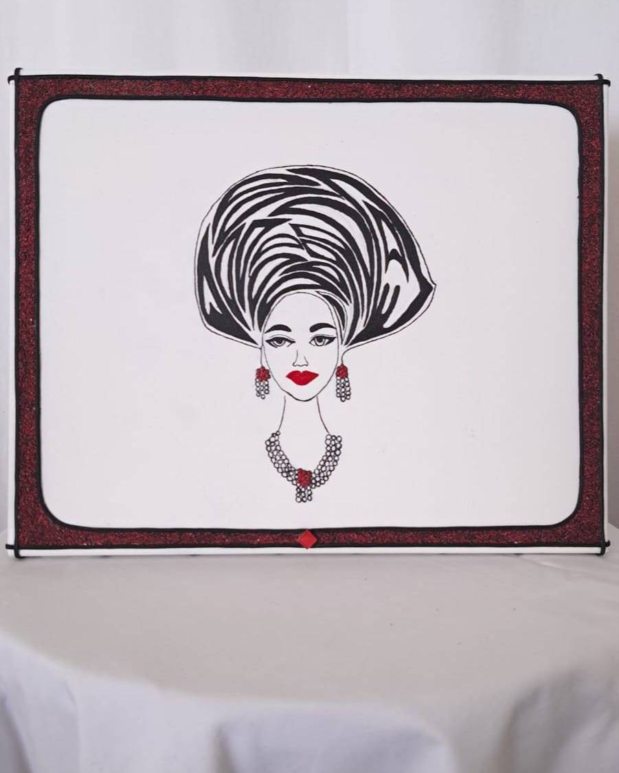 Tableau représentant une africaine travaillé avec de la peinture acrylique. Bordure travaillé avec du sable de couleurs lui donnant un style original.