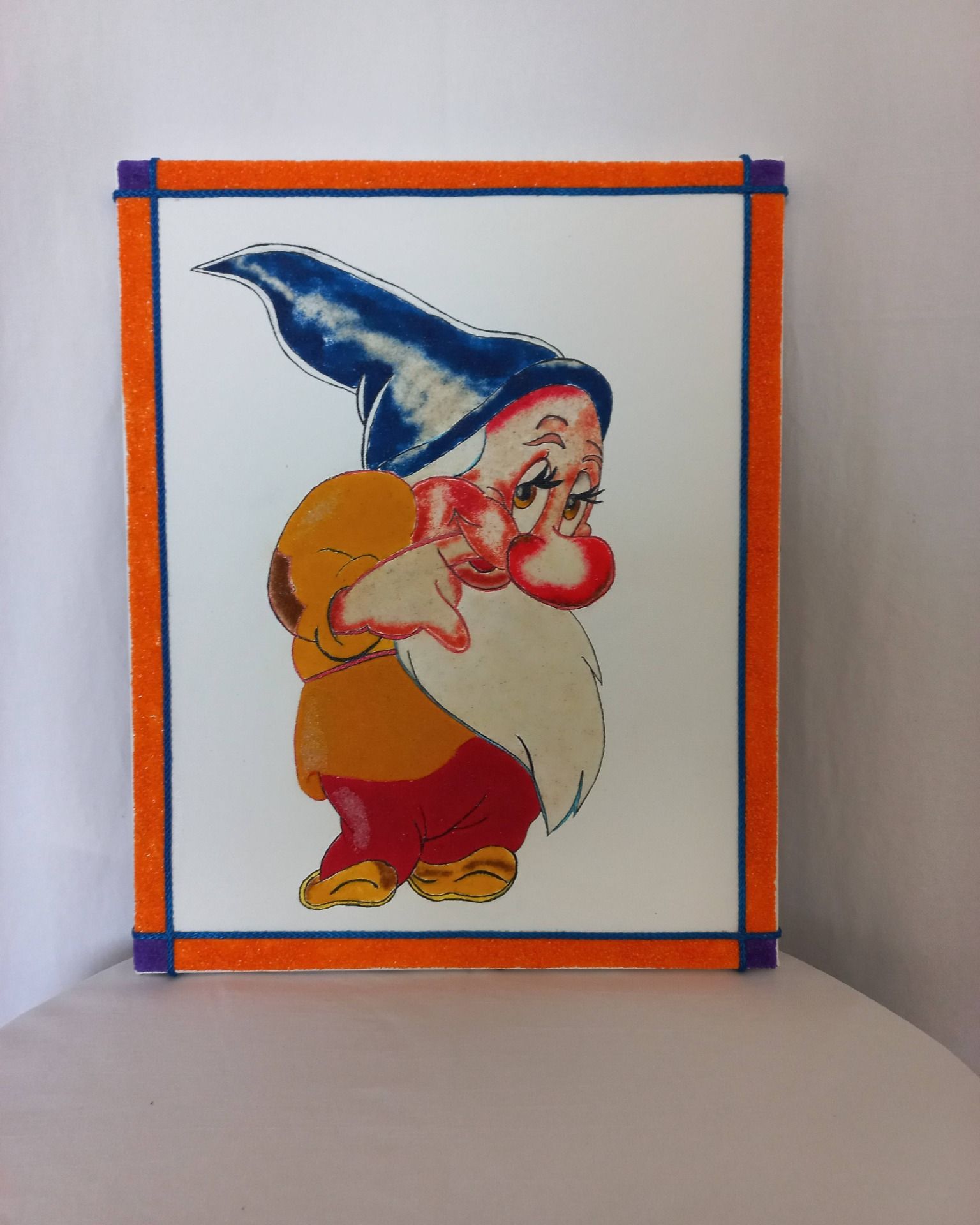 Tableau représentant l'un des seps nains ( timide), travaillé avec du sable de couleurs. Ornera n'importe quel pièce représentant des enfants: chambre, pédiatre, école, etc..