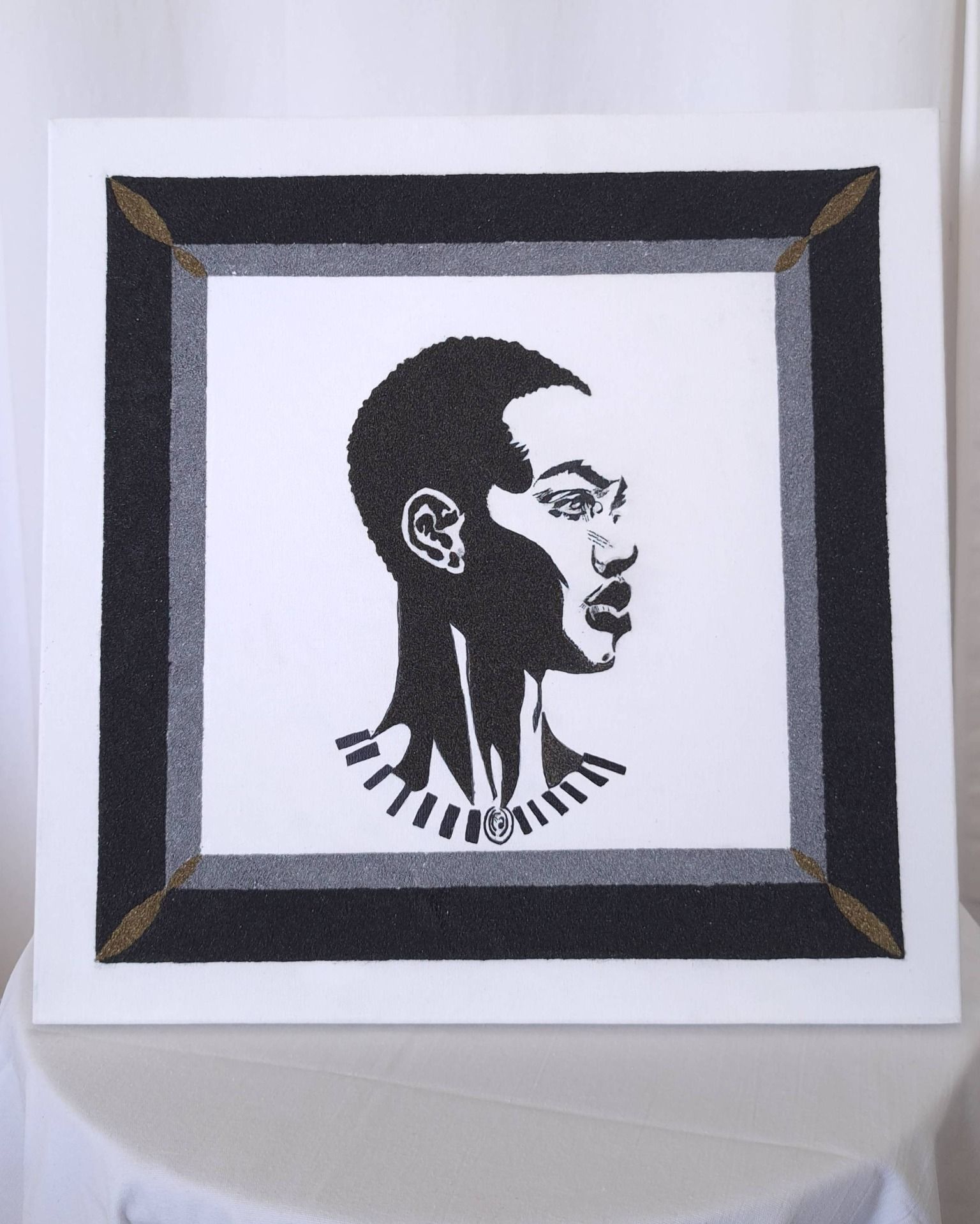 Tableau travaillé avec du sable noir représentant une femme africaine. Encadrement travaillé avec du sable de couleurs noir, gris et doré.