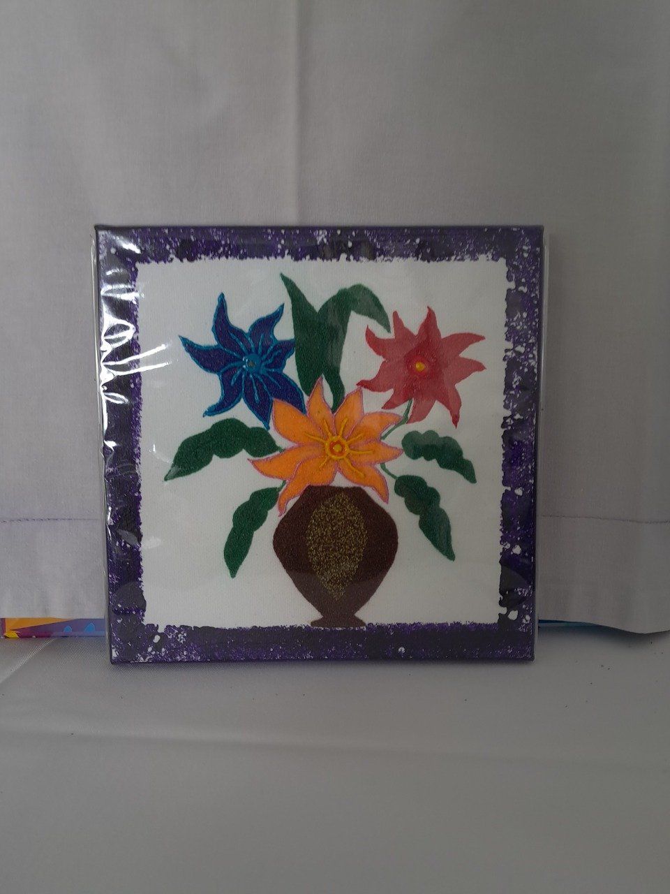 Tableau représentant un vase orné de fleurs travaillé avec du sable de couleurs et de la peinture acrylique 3D.