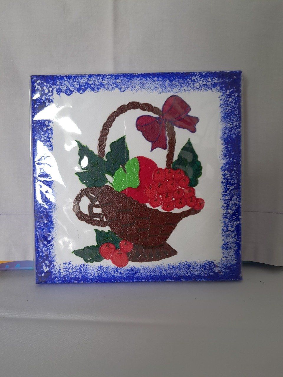 Tableau représentant un magnifique panier de fruit travaillé avec de la peinture acrylique ainsi que de la peinture 3D acrylique. Sublime pour une cuisine.