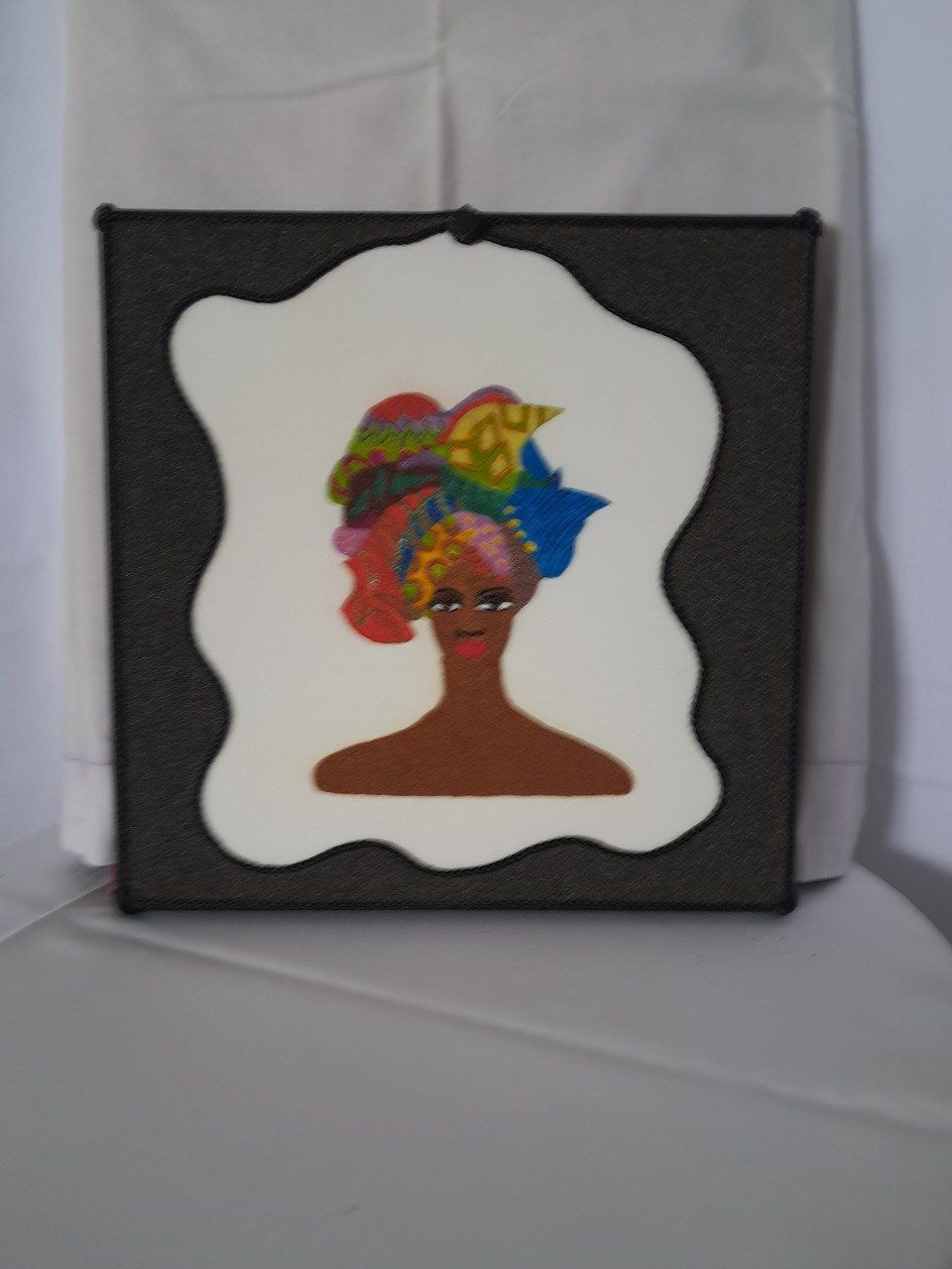Tableau travaillé avec du sable de couleurs représentant une femme entouré de sable noir.