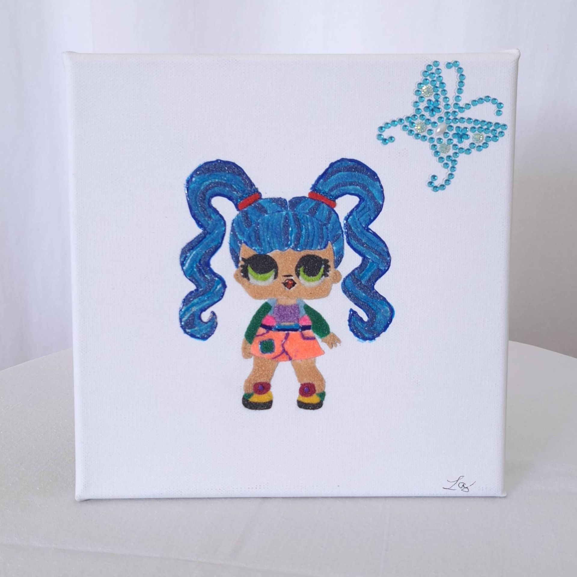 Tableau représentant une poupée LOL travaillée avec du sable de couleurs. Embellira la chambre d' un enfant, un magasin de vêtement pour enfant ou un cabinet de pédiatre etc...
