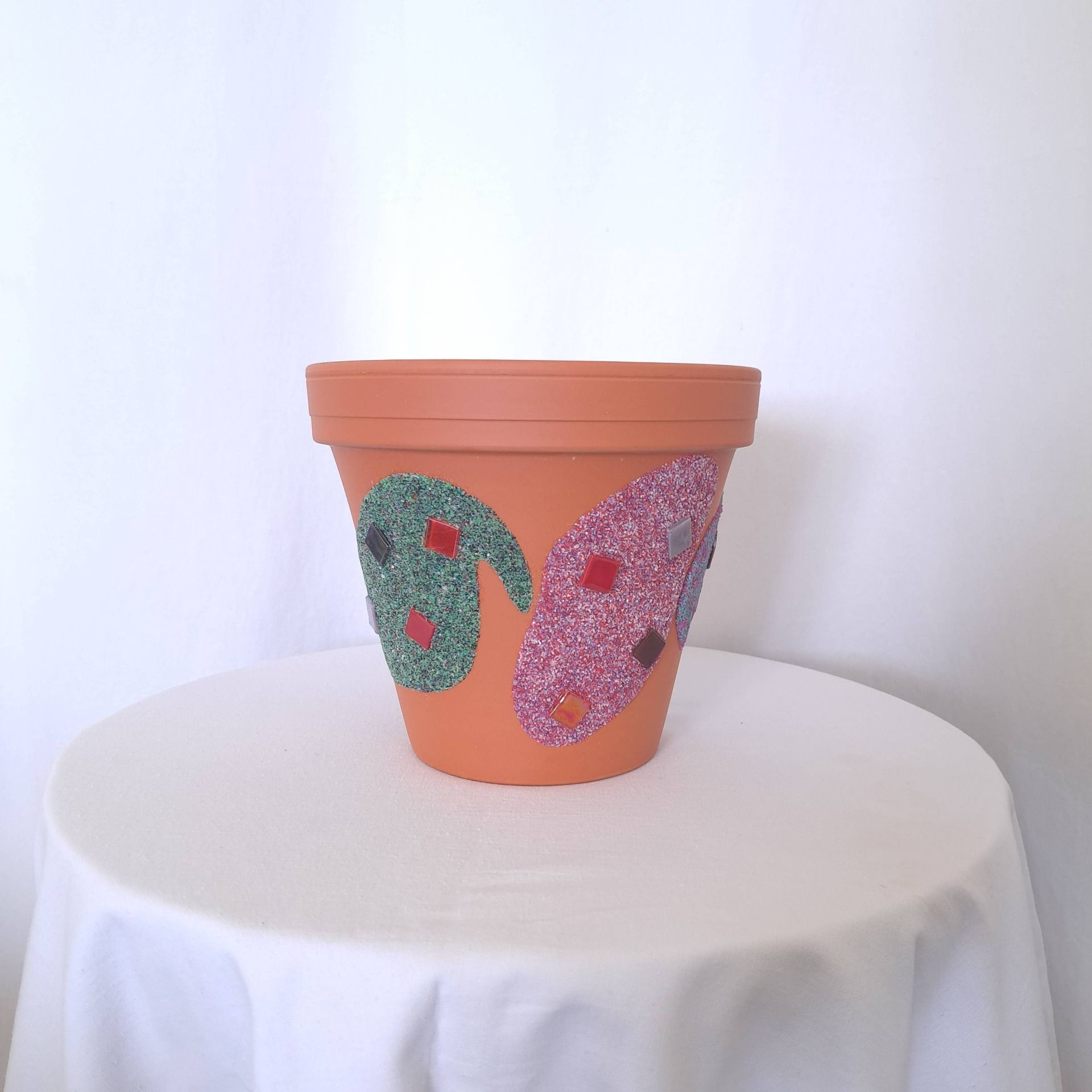 pot en terre cuite travaillé avec du sable de couleurs orné de petit carreaux.