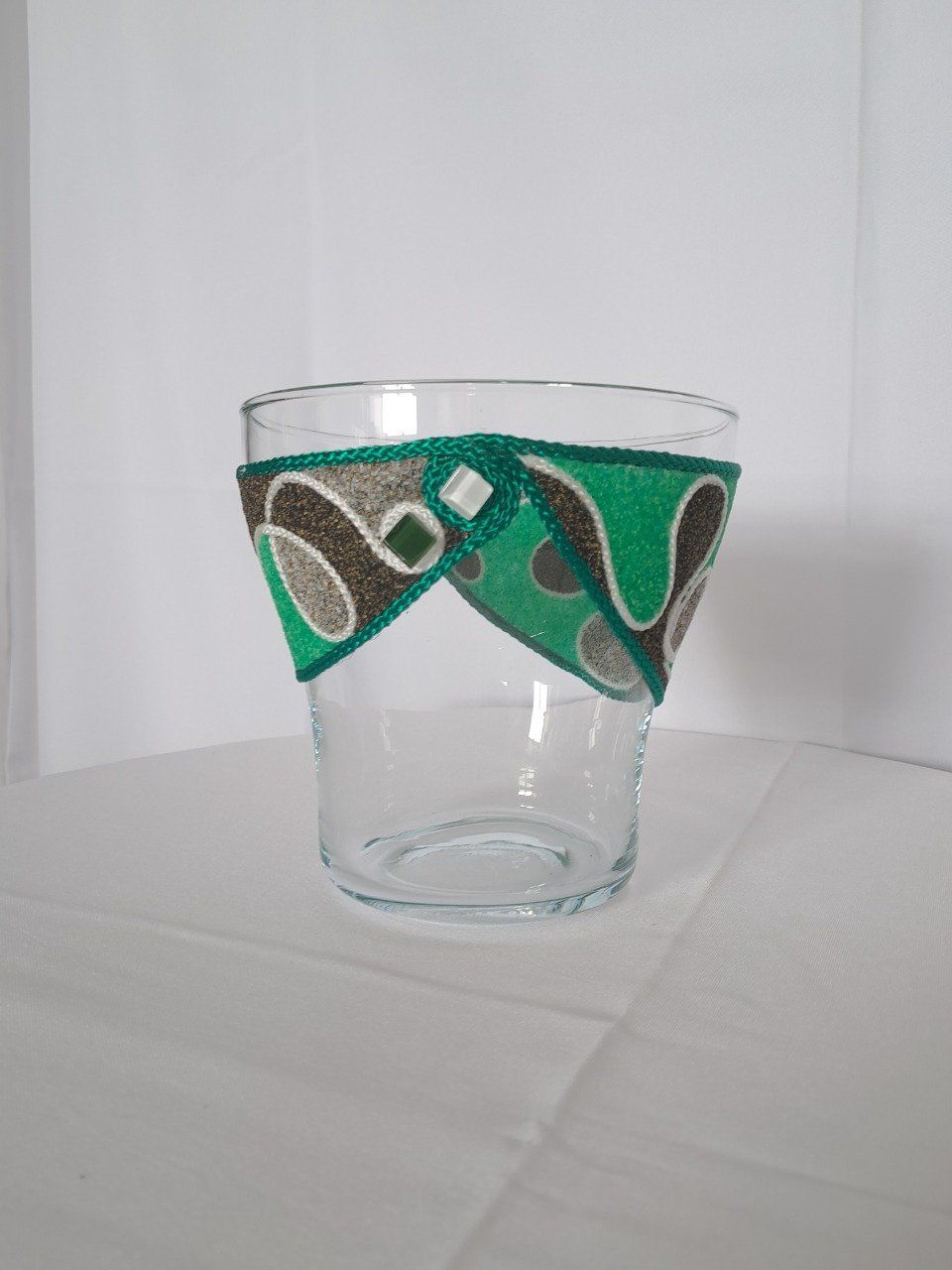 Vase en verre travaillé avec du sable et de la cordelette de couleurs et comme finition des petits carreaux vert et blanc.