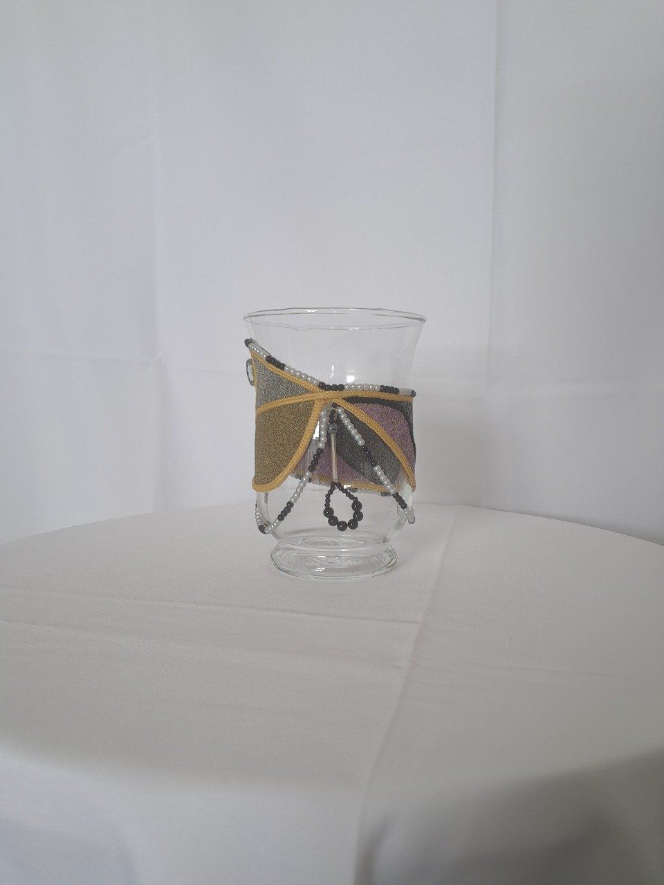 vase en verre travaillé avec de la cordelette et de différentes couleurs de sables, or, violet or, blanc or, noir gris et gris or, le tout entouré de perle noir et gris .