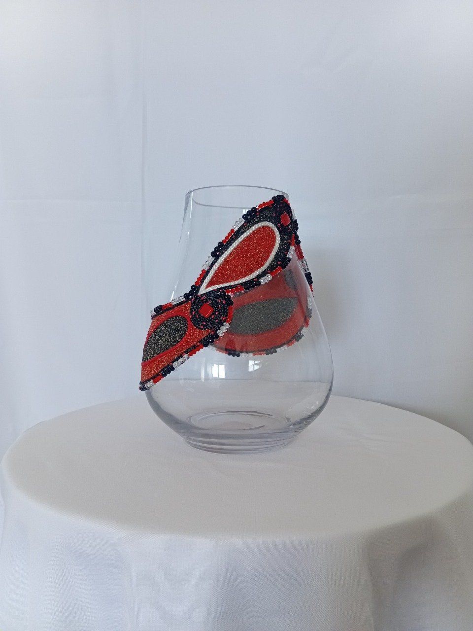 Vase en verre travaillé avec du sable et de la cordelette de couleurs entouré par des perles de couleurs. Finition petit carreau rouge.