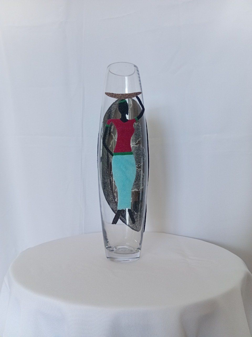 Vase en verre travaillé avec du sable de couleurs et de la cordelettes tressé représentant une africaine.